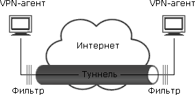 Для передачи данных VPN-агенты создают виртуальные каналы между защищаемыми локальными сетями или компьютерами (такой канал называется "туннелем", а технология его создания называется "туннелированием"). Вся информация передается по туннелю в зашифрованном виде.
